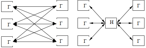 На схеме видно, что наднациональная структура не только координирует деятельность государственных систем, но и существенно упрощает процесс взаимодействия между ними, оптимизируя (сокращая) количество необходимых контактов при принятии решений. «Система, углубляющая внутреннюю дифференциацию и повышающая адаптивные возможности, – отмечает Т.Парсонс, – тем самым усложняется и обязательно сталкивается с проблемами интеграции».[24]