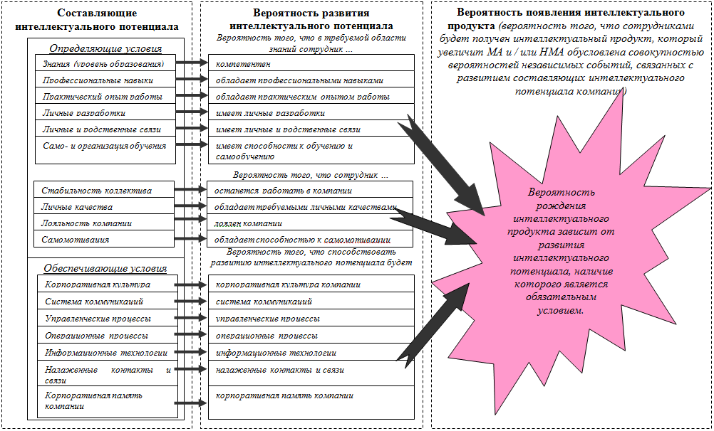 где P(АÇВ) – вероятность возникновения события (АÇВ), иными словами, вероятность появления интеллектуального продукта за счет развитого интеллектуального потенциала;
