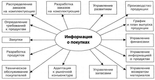 Как видно из представленной схемы, информация о покупках является в CSRP-системах отправной точкой принятия всего спектра управленческих решений в цепочке производства и движения товаров. На её основе осуществляется не только управление, но и планирование производственной деятельности предприятия.