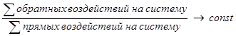Сущность системного анализа на базе общей теории систем заключается в выделении равновесного состояния системы при помощи соотношения Гульдберга-Вааге и последующего исследования причинно-следственного характера отклонений от такого состояния.При этом внешнее воздействие на системы будет всегда являться прямым, а внутреннее (реактивное) – обратным. Значение const отражает равновесное состояние системы в существующих граничных рамках (например, оптимальное производство в рамках совокупного спроса). Здесь возможны два варианта построения индексов: