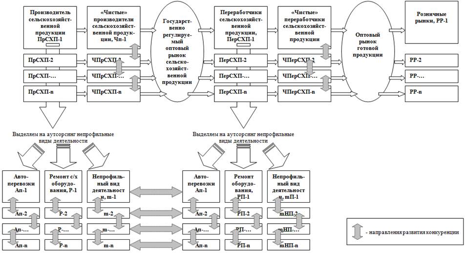 Возвращаясь к рассмотрению предложенной выше концептуальной модели, отметим, что в целом реализация предлагаемых аутсорсинговых мероприятий позволит получить так называемых «чистых» производителей сельскохозяйственной продукции и продукции предприятий переработки. Под понятием «чистые» понимаются предприятия себестоимость которых «очищена» от затрат на непрофильную деятельность. Тем самым мы создадим условия для более равноправной конкурентой борьбы между производителями. Ведь в настоящее время большинство агропромышленных производителей представляют собой некие гиганты, концентрирующие в себе и значительные ремонтные базы, и огромные автотранспортные цеха и строительные управления и т.д. В качестве характерного примера можно привести сахарные заводы, которые проектировались и строились по принципам советского периода, когда основным принципом являлось только обеспечение надежности производственного процесса без соразмерного учета экономической эффективности. В итоге отечественные производители сахара-песка в настоящее время в основном имеют в своем составе: огромные ремонтные базы, строительные управления, автотранспортные управления, собственное весьма капитало- и ресурсоемкое энергетическое оборудования (котельные, тепловые электрические централи) и т.д. При этом сезон переработки сахарной свеклы, т.е. непосредственно, когда завод производит готовую продукцию, составляет всего 5-6 месяцев, в остальное время завод занимается ремонтом оборудования, т.к. импорт сахара-сырца экономически невыгоден, а сахарная свекла уже вся переработана. В таких условиях не трудно догадаться, что в целом производство сахара-песка будет неэффективным, просто себестоимость за счет такого непрофильного «утяжеления» настолько высока, что рыночная цена сахара-песка не может ее покрыть.