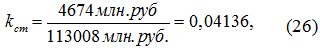 Таким образом, для определения величины стоимости интеллектуального потенциала компании остается определить подходы к расчету коэффициента kст, который учитывает на сколько может быть увеличена стоимость материальных и / или нематериальных активов компании за счет рождения нового интеллектуального продукта. Определение данного коэффициента для конкретного предприятия предлагается производить на основе анализа его прошлой деятельности по формуле: