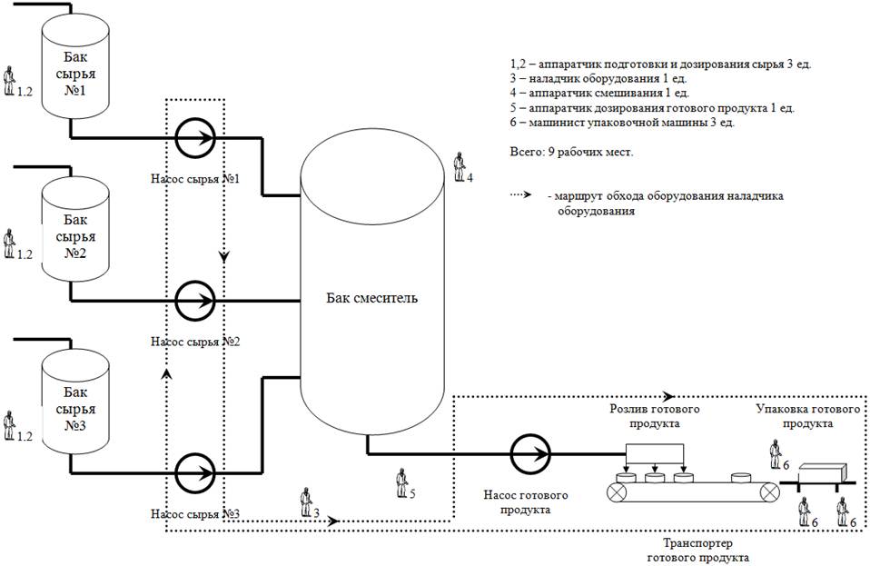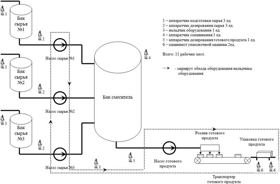 Для начала за основу была взята принципиальная схема производства, на которой технический персонал цеха отобразил фактическую расстановку своего персонала (см.рис.1). При этом был отображен как персонал, производящий продукцию (рабочие места 1,2,4,5,6), так и обслуживающий оборудование (рабочее место 3). Для персонала занимающегося обслуживанием работающего оборудования (наладчики, слесари-ремонтники и пр.) был отображен маршрут обхода оборудования.