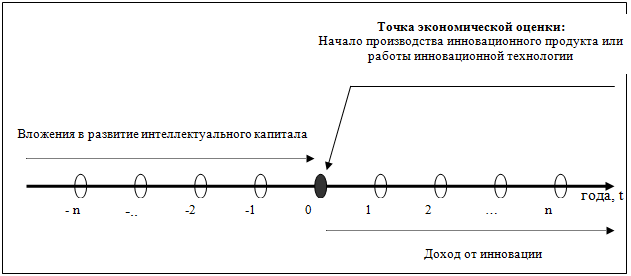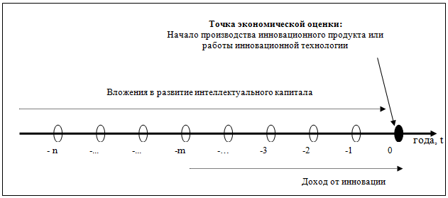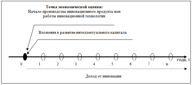 Этот подход обусловлен соображениями сопоставления в настоящий момент времени дисконтированных расходов (вложений в развитие интеллектуального капитала) и дисконтированных доходов от внедренной инновации.