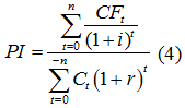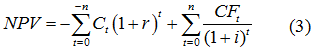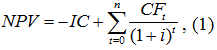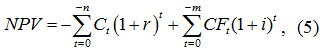 где NPV – сумма дисконтированных значений потока дохода от внедрения инновационного проекта; IC – первоначальные инвестиции в развитие интеллектуального капитала; CFt - платёж через t лет (t = 1,...,n); i – ставка дисконтирования, ее предлагается принимать равной средней банковской процентной ставки, под которую возможно разместить средства. Также возможно применение другой ставки, например доходности альтернативного инвестиционного проекта.
