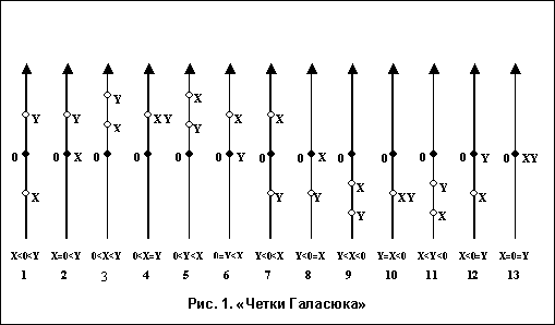 Возможны всего 13 качественно различающихся вариантов соотношения на числовой оси значений двух сравниваемых величин X и Y (см. рис.1)**.