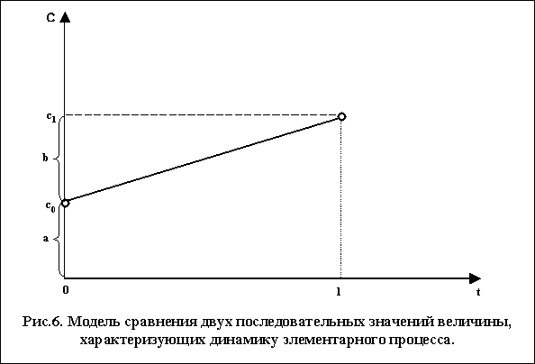 Проиллюстрируем изложенное выше на примере анализа динамики элементарного процесса, характеризуемого в определенные моменты времени величинами с0 и с1. Зафиксируем точки, соответствующие значениям этих величин на координатной плоскости. Учитывая, что ось времени введена условно, для удобства поставим в соответствие с0 и с1 значения t равные 0 и 1 соответственно. Тогда точки, отображенные на координатной плоскости, будут иметь координаты (0;с0) и (1;с1) соответственно (см. рис.6).