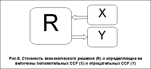 Разница стоимости положительных (X) и отрицательных (Y) условно-денежных потоков (CCF), являющихся вероятным следствием реализации экономического решения, представляет собой стоимость соответствующего экономического решения (R) (см. рис. 6).