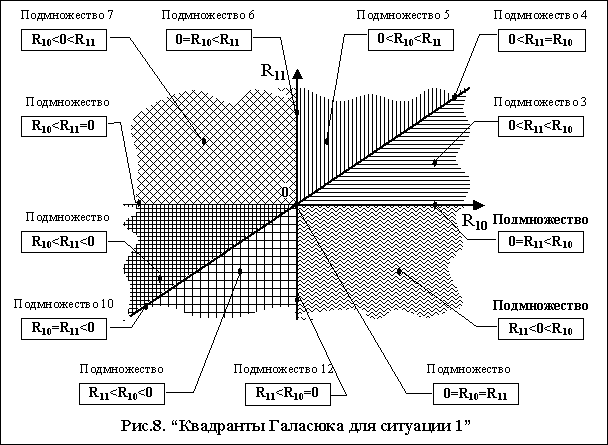 Как видно на “квадрантах Галасюка для ситуации 1” множество возможных соотношений величин R11, R10 и 0 состоит из тринадцати различных подмножеств.