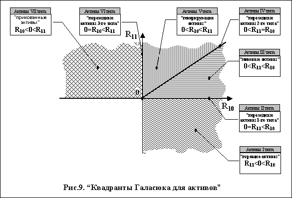 Каждому подмножеству на “квадрантах Галасюка для активов” условно поставим в соответствие определенный тип активов. Активы, находящиеся в области, соответствующей подмножеству 1 определим как активы І типа; активы, находящиеся в области, соответствующей подмножеству 2, как активы ІІ типа; активы, находящиеся в области, соответствующей подмножеству 3, как активы ІІІ типа и так далее (см. рис.9).