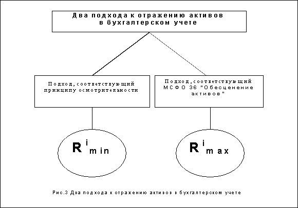 Для ответа на этот вопрос обратимся к Международным стандартам финансовой отчетности. В Международных стандартах финансовой отчетности можно выделить два основных подхода к отражению активов в бухгалтерском учете. Один из подходов, по сути, представлен принципом осмотрительности, зафиксированным в Принципах подготовки и составления финансовой отчетности МСФО. Данный принцип гласит: “...Осмотрительность - это введение определенной степени осторожности в процесс формирования суждений, необходимых в производстве расчетов, требуемых в условиях неопределенности так, чтобы активы … не были завышены...” (выделено нами) [1,с.42]. Таким образом, согласно принципу осмотрительности активы должны отражаться в бухгалтерском учете по меньшей из двух величин стоимости экономических решений R11 и R10. Отражение активов в соответствии с принципом осмотрительности, можно представить следующими концептуальными формулами (см.рис.1).
