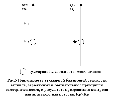 Прекращение контроля над активами, отраженными в соответствии с принципом осмотрительности, по отношению к которым стоимость экономического решения “продолжить контроль над активом“ меньше стоимости экономического решения “прекратить контроль над активом” (Ri11<Ri10), приводит к увеличению суммарной балансовой стоимости активов. Сумма этого увеличения равна сумме превышений стоимости экономических решений Ri10 по отношению к активам, над которыми прекращается контроль, над их балансовой стоимостью, которая в данной ситуации равна стоимости экономических решений Ri11 (см.рис.4).