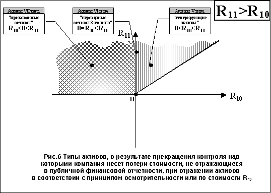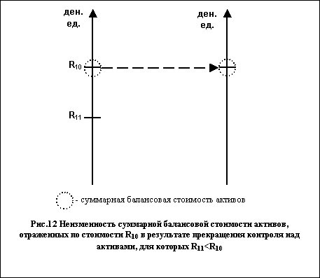 Вместе с тем, прекращая контроль над активами, для которых экономическое решение о продолжении контроля предпочтительнее экономического решения о прекращении контроля (Ri11>Ri10), компания фактически несет потери стоимости на величину ∆=Ri11-Ri10. Так как прекращение контроля над активами, отраженными в соответствии с принципом осмотрительности, по отношению к которым Ri11>Ri10 (см.рис.6), не приводит к изменению суммарной балансовой стоимости активов, то указанные потери стоимости, которые несет компания в результате прекращения контроля над данными активами, не отражаются в публичной финансовой отчетности компании.