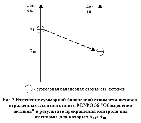 Прекращение контроля над активами, отраженными в соответствии с МСФО 36 “Обесценение активов”, по отношению к которым стоимость экономического решения “продолжить контроль над активом” превышает стоимость экономического решения “прекратить контроль над активом” (Ri11>Ri10), приводит к уменьшению суммарной балансовой стоимости активов. Величина этого уменьшения равна сумме превышений балансовой стоимости активов (в данном случае стоимости экономических решений Ri11), над которыми прекращается контроль, над стоимостью экономических решений “прекратить контроль над активами” Ri10 (см.рис.7).