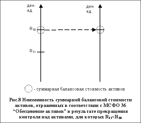Прекращение контроля над активами компании, отраженными в соответствии с МСФО 36 “Обесценение активов”, по отношению к которым стоимость экономического решения “продолжить контроль над активом” меньше стоимости экономического решения “прекратить контроль над активом” (Ri11<Ri10) не приводит к изменению суммарной балансовой стоимости активов компании, так как в этом случае их балансовая стоимость равна стоимости экономического решения Ri10 (см.рис.8).