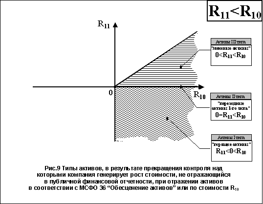 Вместе с тем, прекращая контроль над активами, для которых экономическое решение о прекращении контроля предпочтительнее экономического решения о продолжении контроля (Ri11<Ri10), компания фактически генерирует рост стоимости на величину ∆=Ri10-Ri11. Так как прекращение контроля над активами, отраженными в соответствии с МСФО 36 “Обесценение активов”, по отношению к которым Ri11<Ri10 (см.рис.9), не приводит к изменению суммарной балансовой стоимости активов, то рост стоимости, генерируемый компанией в результате прекращения контроля над данными активами, не отражается в публичной финансовой отчетности компании.