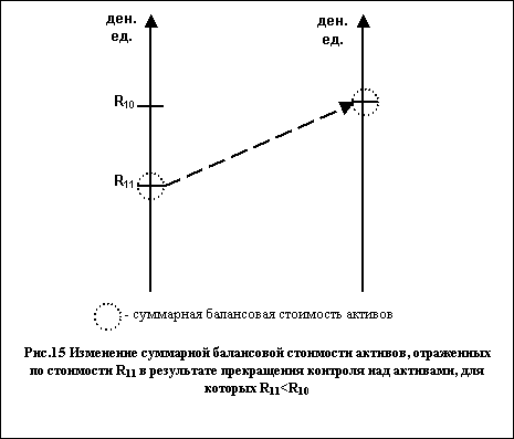 Прекращение контроля над активами, отраженными по стоимости экономического решения Ri11, по отношению к которым стоимость экономического решения “продолжить контроль над активом” меньше стоимости экономического решения “прекратить контроль над активом” (Ri11<Ri10) приводит к увеличению суммарной балансовой стоимости активов. Сумма этого увеличения равна сумме превышений стоимости экономических решений Ri10 по отношению к активам, над которыми прекращается контроль, над их балансовой стоимостью (в данном случае стоимостью экономических решений Ri11) (см.рис.15).