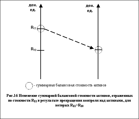 Прекращение контроля над активами, отраженными по стоимости экономического решения Ri11, по отношению к которым стоимость экономического решения “продолжить контроль над активом” превышает стоимость экономического решения “прекратить контроль над активом” (Ri11>Ri10) приводит к уменьшению суммарной балансовой стоимости активов компании. Сумма этого уменьшения равна сумме превышений балансовой стоимости (в данном случае стоимости экономических решений Ri11) активов, над которыми прекращается контроль, над стоимостью экономических решений Ri10 (см.рис.16).