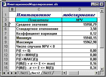4. На основе полученных в результате имитации данных рассчитываются критерии, количественно характеризующие риск ИП (матожидание NPV, дисперсия, среднеквадратическое отклонение и др.).