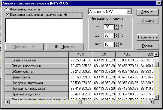 1.Определяются ключевые факторы ИП. Для этого предлагается применять анализ чувствительности по всем факторам (цена реализации, рекламный бюджет, объём продаж, себестоимость продукции и т. д.), используя специализированные пакеты типа Project Expert и Альт-Инвест, что позволит существенно сократить время расчётов. В качестве ключевых выбираются те факторы, изменения которых приводят к наибольшим отклонениям чистой текущей стоимости (NPV).