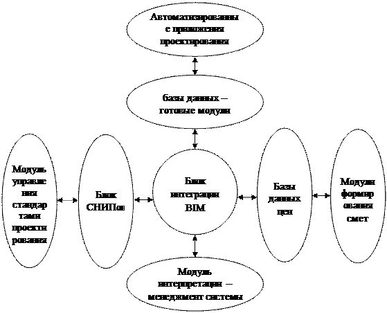 Разработчики концепций BIM видят инструментальной основной снижения трансакционных затрат внедрение систем автоматизации процессов поиска информации и подготовки решений субъектами предпринимательства, другими словами - обеспечение процессов, осуществляющие инвестиционно-строительную деятельность через сформированную информационную инфраструктуру регионального ИСК. В частности концепция BIM «Национального института стандартов и технологий США» (NIST) (в рамках проектов «Национального института строительства» (NIBS), [10]) интерпретированная на рис. 1.2, представляет собой 4-х векторную интегрированную модель. Каждый из векторов реализуется автоматизированным модулем, направленным на решение задач этапа инвестиционно-строительного цикла: архитектурно-строительное проектирование (CAD системы); планирование строительного цикла; сметное и контрактное планирование и контроль; интегрированное управление циклом. Автоматизированный модуль опирается на отраслевые информационные базы, содержащие нормативную строительную документацию, готовые модули принятия решений (кейсы), стандарты проектирования, базы подрядных организаций, актуальные цены на строительные материалы и конструкции (рис. 1.2). Модель BIM, предложенная NIST, дает понимание о направленности информационной инфраструктуры инвестиционно-строительной деятельности в США, но представленная схема в большей степени выражает специфику инвестиционно-строительных процессов страны, векторах формирования трансакционных затрат, и в силу этого не может рассматриваться как научно универсальная.