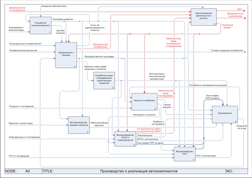 Чем более зрелой становится компания на пути управления бизнес-процессами, тем больше увеличиваются ее потребности. Появляется интерес к моделированию бизнес-процессов сверху-вниз: от процессов верхнего уровня к процедурам. Здесь можно провести аналогию с созданием автомобиля. Его проектирование начинается с определения базовых узлов и компоновки, и только потом начинается проектирование каждого узла в отдельности вплоть до мельчайшего винтика. В этом состоит системный подход к проектированию – от общего к частному. Процессы верхнего уровня также должны быть логично организованы для того, чтобы вся система бизнес-процессов была работоспособна. Для реализации этого подхода Business Studio поддерживает нотацию моделирования IDEF0 (рис.4).