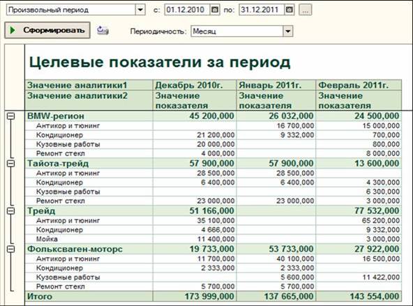 Представление панелей бизнес-показателей может быть в двух основных видах. Первый – это персонифицированная матрица результативности. В такой матрице указан состав показателей, который определяет результативность протекающих бизнес-процессов и операций под управлением конкретного сотрудника или руководителя. Второй – это параметризированный отчет, который выводит те же данные без привязки к уровням ответственности. В таком отчете заложена возможность проведения многомерного анализа данных с использованием различных аналитических разрезов. Анализ может производиться как изменение показателей в динамике, так и на предмет соответствия или отклонения от плановых значений.