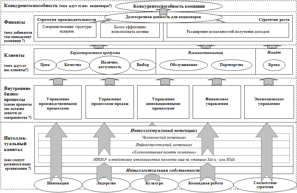 На основе разработанной стратегии Советом по стратегическому развитию была сформирована стратегическая карта, в которой определены ключевые направления деятельности, с помощью которых компания предполагает достижение своих стратегических целей. В качестве таковых в системе сбалансированных показателей (далее ССП) выделяются: финансы, клиенты, внутренние процессы, обучение и развитие. Однако участниками Совета было предложено в качестве последней составляющей рассматривать не «обучения и развития», а более широкое понятие – «интеллектуальный капитал» компании. Таким образом, для компании «АгроПрогресс» была предложена следующая система (рис. 1).