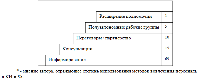 В целом можно сказать, что в КИ используются все методы вовлечения персонала выделенные в модели ««Лестница» методов вовлечения персонала и расширения полномочий» [6]. Однако, степень их использования разная (см.рис. 1.6).