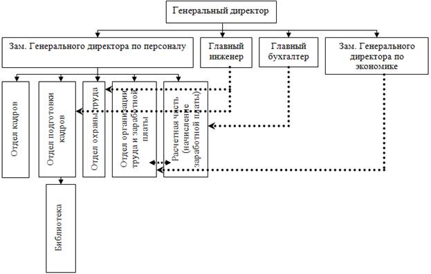 На рис.2, пунктирными линиями представлена требуемая трансформация организационной структуры. Кроме того, предлагается объединить отдел организации труда и заработной платы с расчетным отделом бухгалтерии и переименовать отдел кадров в отдел подбора персонала и кадрового документооборота, выстроив, таким образом, следующую организационную структуру (рис. 3).