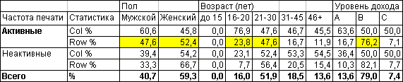 В качестве основной услуги фотосалона было рассмотрено печатание фотографий. Поэтому, большинство вопросов анкеты было сформулировано для подробного исследования именно этого показателя. На основе полученных данных была составлена таблица, согласно которой можно выделить несколько групп потребителей услуг по печати фотографий. В таблице использованы показатели: Col % – процент по колонке – например, процент мужчин, которые являются активными потребителями данных услуг, равен 60,6 (все мужчины принимаются в данном случае за 100%, и считается, сколько из них являются активными потребителями); Row % –процент по ряду – например, процент активных потребителей среди мужчин равен 47,6% (в этом случае за 100% принимаются все активные потребители, и выясняется, сколько из них являются мужчинами). Я специально перевела количественные данные в процентные, чтоб Вы имели представление о рынке фото услуг в целом.