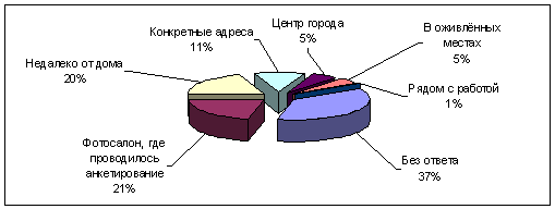 География магазина – важный стратегический аспект не только для фотомагазина. Другое дело, что не всегда удаётся «занять более выгодную позицию» с точки зрения удобства для клиента. Поэтому очень обрадовал результат, согласно которому большинство ответивших респондентов (21%) считают для себя удобным тот фотосалон, где проводилось исследование (то есть, место выбрано верно). 20% считают удобным расположение фотосалона рядом с домом, 11% (в сумме) респондентов указали конкретные адреса.