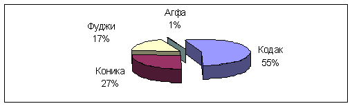 Согласно бухгалтерским данным по продажи фотоплёнки за исследуемый период, основные позиции удерживает плёнка Кодак (55%), за ней идут Коника, Фуджи и Агфа (27% , 17% 1% и соответственно).