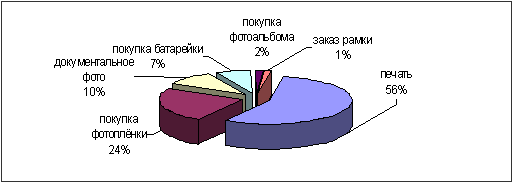 Диаграмма показывает, что основной вид услуг для всех фотосалонов – это печать с негативов (как правило, все фотосалоны включают в стоимость фотоплёнки – проявку, поэтому проявка не была выделена в отдельный показатель). Это характерно для многих, но не всех фотосалонов: некоторые специализируются на виньетках (фотографии с «окошечками» для школ и детских садов), другие позиционируют свой фотомагазин, как фото студию и специализируются на художественных фотографиях.