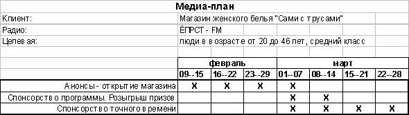 Итак. Открытие магазина женского белья «Сами с трусами» (это – рабочий вариант названия, а можно и: «Галатея», «Венера» и др.) приурочили к 1 марта. Схематично график проведения рекламных мероприятий изображен в медиа-плане.