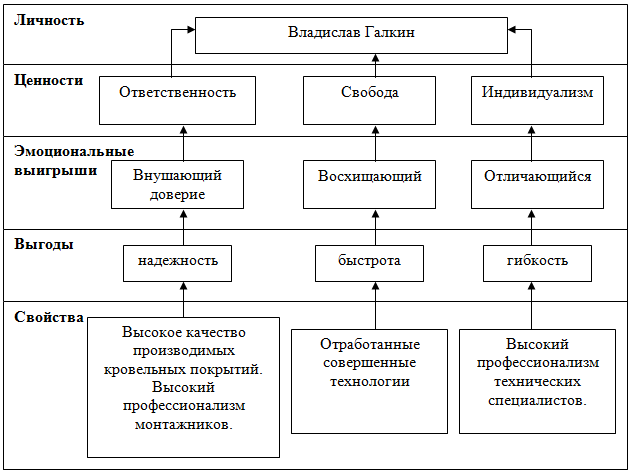 При этом основная цель построения пирамиды сущности бренда – донести до сотрудников компании основные характеристики бренда и отразить существенные компоненты бренда, которые важны для потребителя. В вершине пирамиды сущности бренда стоит человек (известная личность), который обладает сформированными ниже характеристиками и вызывает у людей соответствующие ассоциации. В нашем случае специалисты компании «Кровля+» поставили во главу пирамиды актера Владислава Галкина. В перспективе планируется его привлечение в рекламную компанию организации.