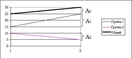 Поскольку Y0 = å Yi , то в соответствии со свойством аддитивности линейных функций, A0 = å Ai , т.е. единичное приращение суммарного сбыта состоит из единичных приращений (с обоими знаками) сбыта всех групп продукта, включенных в ассортимент предприятия, что и проиллюстрировано ниже на примере, где общий объем сбыта состоит из двух групп. Наглядно видно, что суммарное приращение сбыта A0 состоит из A1 и A2 , причем группа 1 обеспечивает положительный прирост сбыта, а группа 2 - отрицательный, т.е. тянет предприятие назад.