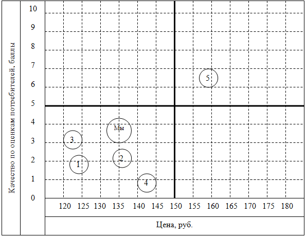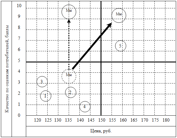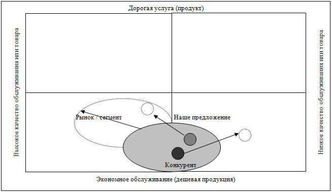 Таким образом, наша организация может сфокусироваться на оказании услуг именно в этом сегменте. Методами конкурентной борьбы при этом могут быть предоставление услуги более высокого качества по сопоставимой с конкурентом цене. Эта перспектива показана на рис.4 жирной стрелкой. Возможен и другой вариант: в сегменте с приемлемой ценой и высоким качеством вообще нет конкурентов. Мы можем попробовать себе в этом секторе рынка. Эта перспектива показана на рис. 4 пунктирной стрелкой.