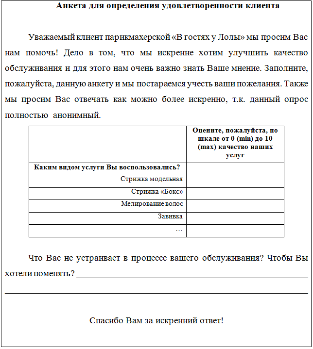 Еще хочется остановиться на одном актуальном вопросе, а именно на способах получения исходной информации о рынке на котором вы работаете. Конечно же, вам не под силу платить значительные средства различным маркетинговым агентствам, чтобы они изучали ваш рынок и давали рекомендации. Но этого вам пока и не нужно! Дело в том, что основная часть информации у вас уже есть. Если вы постоянно работаете на этом рынке, то значительная часть информации у вас уже есть в голове, а недостающую часть, как правило, несложно найти в открытом доступе сети Интернет, местные газеты, объявления и т.д. Если и этого недостаточно, то можно порекомендовать провести опрос своих клиентов или просто людей на улице. При этом в принципе никто не мешает опрашивать людей в непосредственной близости от мест работы конкурентов. Для этих целей можно нанять за весьма небольшие деньги студентов, раздать им анкеты, в которых они должны будут отразить мнения опрашиваемых людей. Анкеты для опроса вам будет несложно составить и самим в этом ничего хитрого нет. Анкета может выглядеть, например, так: