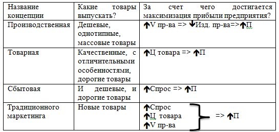 Из таблицы видно, что концепция маркетинга объединяет в себе основания максимизации прибыли всех предыдущих концепций.