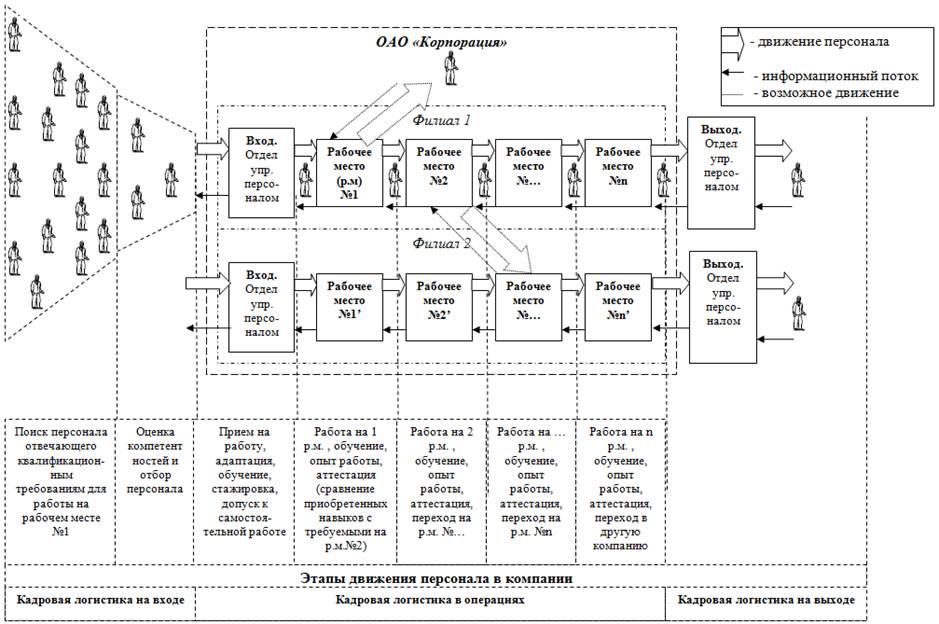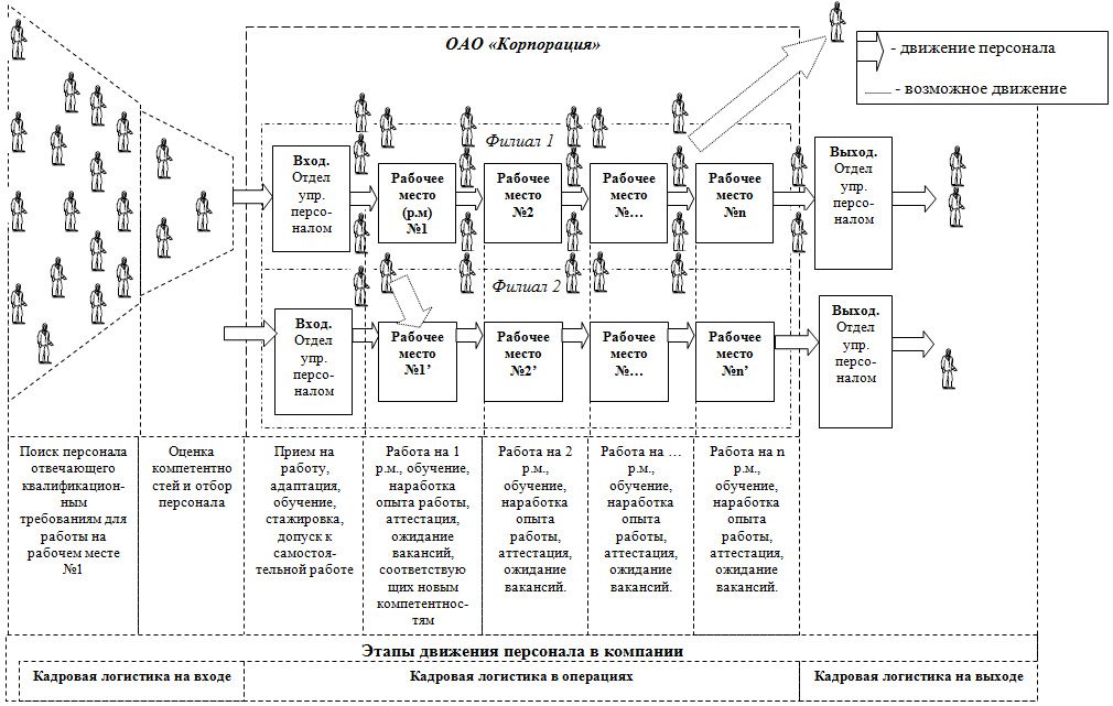 В тоже время, как нам представляется, было бы интересным, с точки зрения поиска новых путей повышения эффективности деятельности компании, применение к системе управления персоналом логистических принципов. Дело в том, что кадровое перемещение персонала в организации достаточно систематизировано и соответственно можно говорить о наличии потока человеческих ресурсов. Соответственно если есть поток, то им можно эффективно управлять на основе логистических технологий.