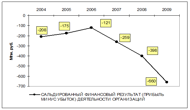 Рис. Динамика финансового результата деятельности организаций в Туве за 2004-2009 годы, млн. руб.[2]