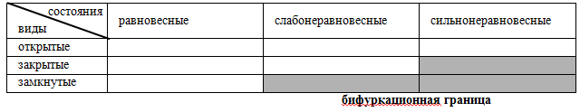 Иначе говоря, когда в закрытой системе не хватает ресурсов, чтобы гасить отрицательные воздействия внешней среды, она все равно переходит в состояние открытости, но уже на качественно более низком уровне самоорганизации и в новых граничных рамках. Отсюда вытекают некоторые закономерности поведения систем в зависимости от степени открытости и равновесности их состояния, которые можно проиллюстрировать при помощи следующей таблицы: