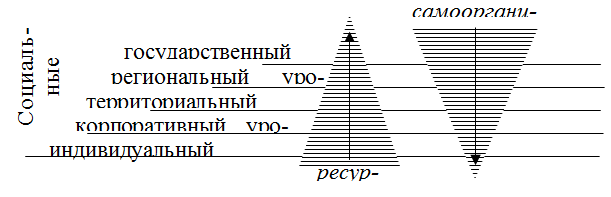 Здесь очень хорошо видна двойственность интерпретаций. Если говорить о самоорганизации, то в качестве внешней среды выступает государство (верхние уровни), которым снизу делегированы управленческие полномочия. Если говорить о ресурсных потоках – в качестве внешней среды выступают носители интересов низших уровней. Интересы стабильности низших уровней всегда приоритетны по отношению к интересам стабильности верхних уровней. Сначала происходит удовлетворение минимальных ресурсных потребностей низших уровней и уже затем ресурсы перераспределяются на высшие уровни[4].