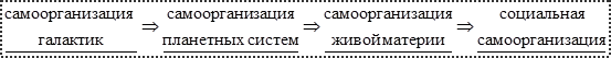 Диалектический принцип «перехода количественных изменений в качественные» проявляется в том, что вселенская самоорганизация материи неизбежно ведет к возникновению жизни и разума. И это единый процесс самоорганизации материи в расширяющейся Вселенной. Можно даже провести логическую цепочку: