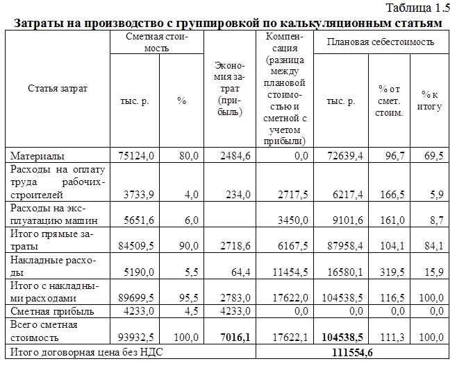 - по статьям затрат (для планирования и контроля затрат на производство строительной продукции, табл. 1.5).