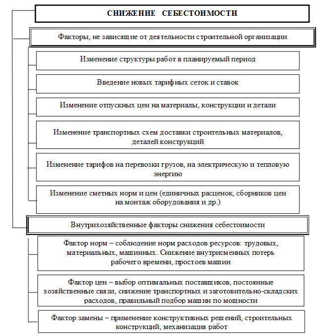 В качестве основных мероприятий, способствующих снижению себестоимости за счет трудовых затрат, рекомендуется упорядочение тарификации работ и рабочих; совершенствование нормирования и оплаты труда, организации производства и труда для предупреждения сверхурочных работ и оплаты простоев не по вине рабочих; недопущение переделок и брака; сокращение трудоемкости работ.