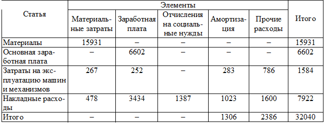 В структуре себестоимости по элементам затраты на заработную плату имеют гораздо больший удельный вес, чем при распределении затрат по статьям, так как к основной зарплате рабочих при поэлементном анализе прибавляется дополнительная, а также зарплата ИТР и работников, занятых управлением и обслуживанием строительных механизмов. Доля затрат по зарплате уменьшилась с 36 до 32 %, что обусловило снижение себестоимости на 6,12 %.