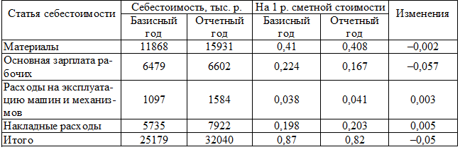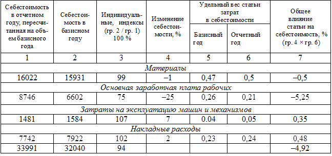 Наибольшее влияние на относительное снижение себестоимости оказало уменьшение затрат на основную заработную плату рабочих.