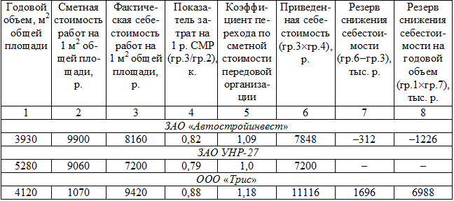 Одним из методов сравнительного анализа себестоимости СМР с целью выявления резервов является метод экономического подобия (табл. 3.14). Его целесообразно применять, когда резервы снижения себестоимости не могут быть выявлены в рамках анализа хозяйственной деятельности только одной организации.